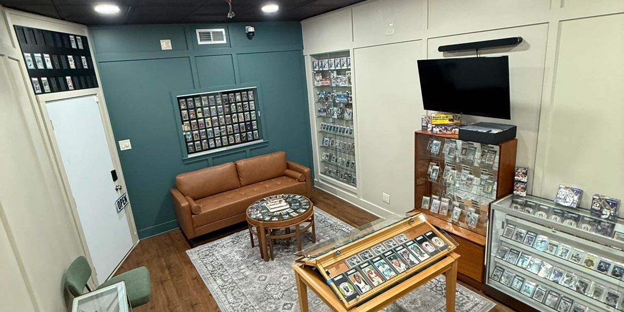 A shrine to nostalgia and speculation in equal measure — glass cases of cardboard heroes, some worth a fortune, most worth a memory. Where collectors argue value, kids press their noses to the display, and everyone secretly hopes they're sitting on a rookie nobody's noticed yet.